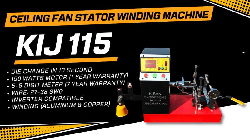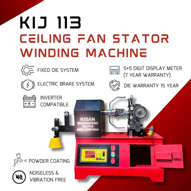 We offer the best product range of Ceiling Fan Stator Winding Machine - KIJ 113, Electric Ceiling Fan Winding Machine (Fixed Die & Brake System) - KIJ 115, 2-in-1 Ceiling Fan Winding and Coil Making Machine - KIJ 111 (Hand Operated), Semi Automatic Ceiling Fan Stator Winding Machine - KIJ 117 (Hand System) and Fully Automatic CNC Ceiling Fan Winding Machine (Dual Head) - Kij 200.