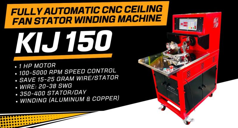 The Kisan Engineering KIJ-150 is a modern electric-operated CNC coil winding machine designed for high production efficiency. This model is capable of winding 500-600 fan stators per day, making it ideal for large-scale manufacturing.