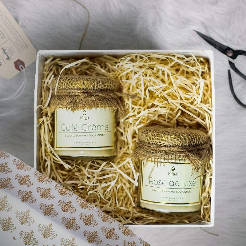 Contents: 2 scented soy candle in a clear glass container(180 gm), 10 Bamboo Light Sticks, 1 Candle Care Card, Elegant Gifting Box
