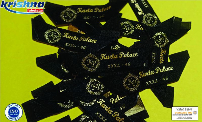 Luxury woven label with a black base and rich golden woven content for a premium touch. The golden yarn adds a metallic sheen without using foil, ensuring longevity. Best suited for high-end ethnic or designer garments. The labels texture is firm and elegant. Perfect for adding a regal look to bridal or couture collections.