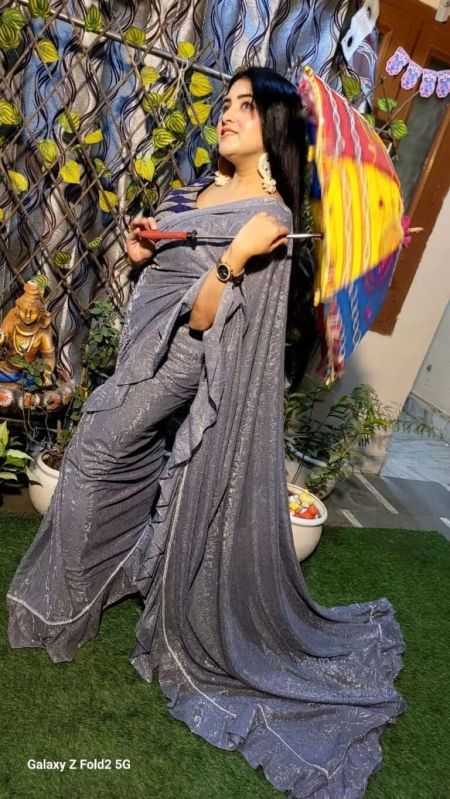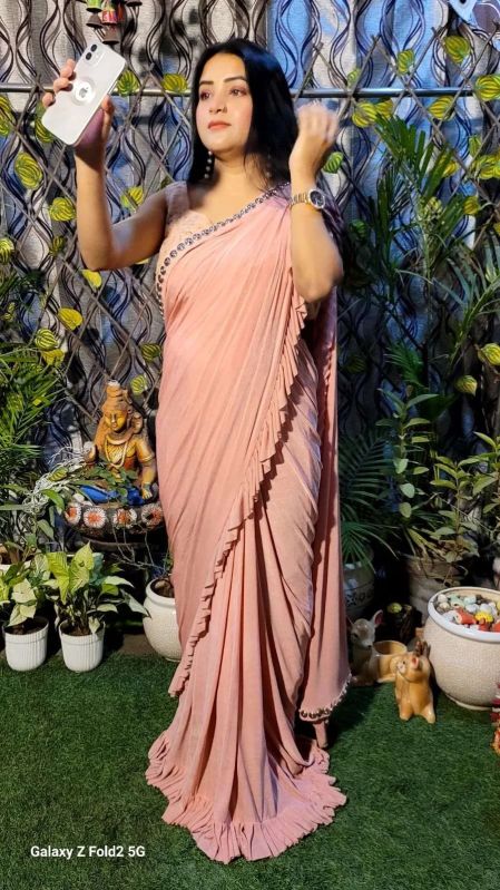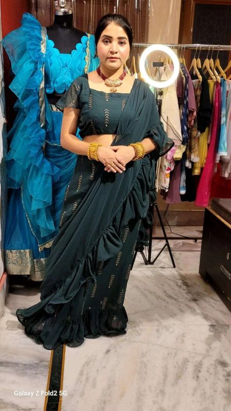 DESIGN DETAILS: Experience the splendor of our latest summer festive addition, the Lemon Yellow Printed Ruffle Saree With Blouse. This pre-pleated crape saree is not only easy to wear but also incredibly versatile, fitting comfortably for any size. The elastic-free design ensures a hassle-free experience. The saree boasts a stunning ruffle pallu with a shimmering effect, creating an enchanting aura. The accompanying blouse features a wide v-neckline and intricate work in a floral pattern, complete with a side zip closure. This set embodies elegance and modern glamour, making it the perfect choice for those special occasions when you want to shine with sophistication. Shop this Saree in another shade: Baby Pink