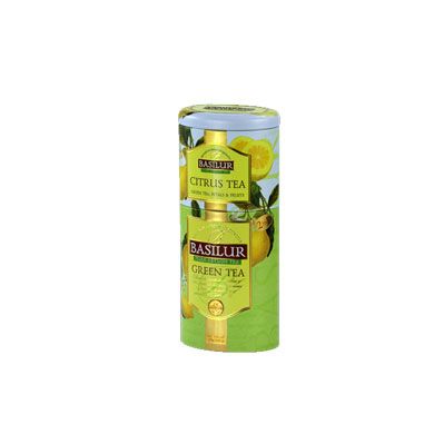 100% pure ceylon tea with natural fruits exclusive premium quality basilur citrus tea the top tin carry green loose/leaf tea with natural fruits pineapple, papaya, natural flowers marigold, rose petals and lemon flavour – 50g. the bottom tin carry green loose/leaf tea from the high grown elevations of ceylon -75g, no additives. cup colour is yellowish green, light in cup.