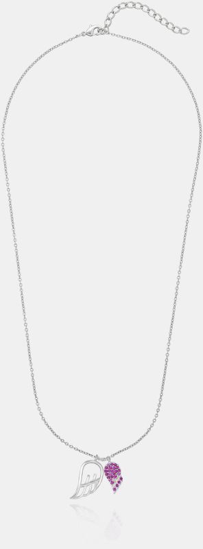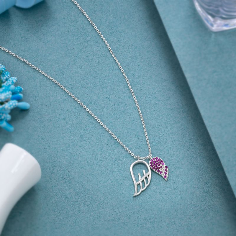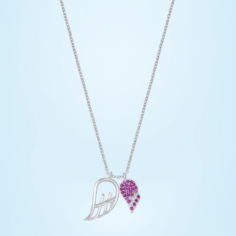 This necklace combines an intricate angel wing with a heart-shaped pendant, beautifully adorned with sparkling cubic zirconia stones. It represents love, care, and spiritual guidance with a dazzling touch.