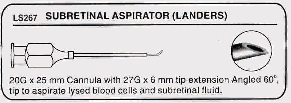20G X 25MM Cannula with 27G X 6 MM TIP extension Angled 60 degree tip to aspirate lysed blood cells and subretinal fluid.