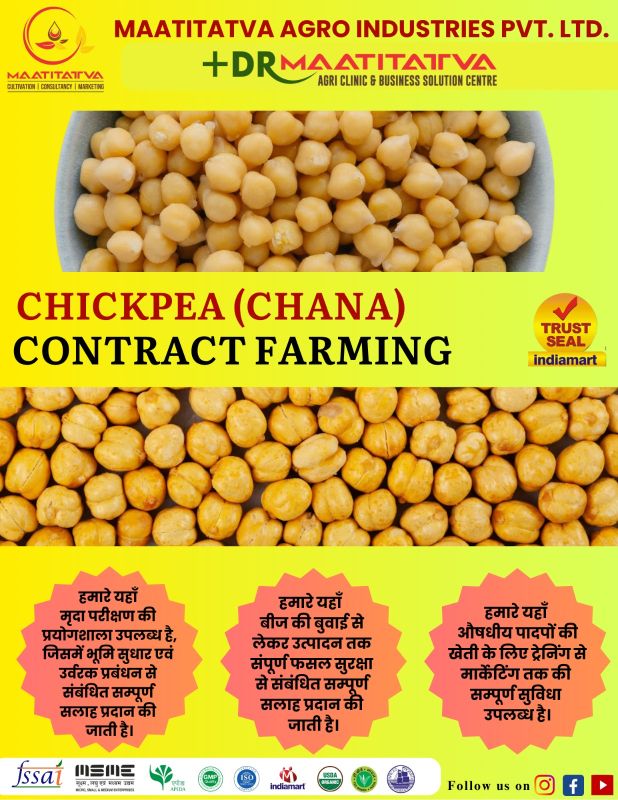 Maatitatva Agro Industries Pvt. Ltd. offers dependable and value-driven contract farming services for Chana (Gram/Chickpeas), designed to support farmers with a complete cultivation-to-market solution. Our contract model ensures the supply of certified, high-yielding seeds, timely agri-inputs, and full agronomic support throughout the crop cycle. From sowing and crop management to harvesting and procurement, our team works alongside farmers to ensure high productivity and premium quality. With assured buyback agreements at pre-fixed prices, we eliminate market uncertainties and provide farmers with financial stability and confidence. At Maatitatva Agro Industries Pvt. Ltd., our mission is to build a transparent, sustainable, and profitable farming ecosystemempowering farmers to grow Chana efficiently while contributing to the nations pulse production.