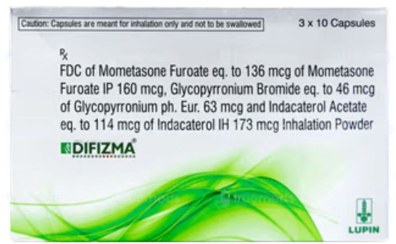 Difizma Lupin Capsules are a combination inhalation therapy used for the long-term management of Chronic Obstructive Pulmonary Disease (COPD) and asthma. Each capsule contains Tiotropium Bromide and Formoterol Fumarate, two powerful bronchodilators that work together to improve airflow, reduce symptoms, and enhance respiratory comfort in patients with chronic lung conditions.