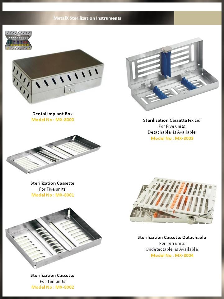 We are offering sterilization cassette.we are manufacturer and exporter of dental implant instruments.The quality management system has been properly implemented and is successfully working at all production stages. We carry out all the necessary tests, inspections and process control activities to ensure that there is no problem with the instruments performance. The technical specifications are provided for more understanding of the products and to improve the confidence of the customer. Samples and prices can be obtained on demand.If you have any queries, please don't hesitate to contact us. Our certificationce markiso-9001:2008iso-13485:2003 thanks and best regards, metalx international