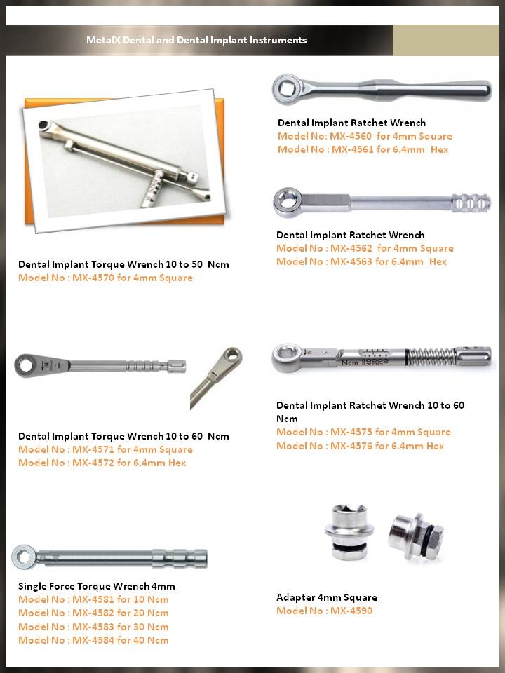 we are manufacturer and exporter of dental implant instruments.the quality management system has been properly implemented and is successfully working at all production stages. we carry out all the necessary tests, inspections and process control activities to ensure that there is no problem with the instruments performance. the technical specifications are provided for more understanding of the products and to improve the confidence of the customer. samples and prices can be obtained on demand.if you have any queries, please don't hesitate to contact us. our certificationce markiso-9001:2008iso-13485:2003 thanks and best regards, metalx international