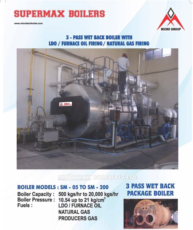 MICROTECH IS OFFERING 3-PASS FULLY WET BACK FIRE TUBE OIL / GAS / OIL CUM GAS FIRED BOILERS WITH CORRUGATED FURNACE / STIFFNERS MANUFACTURED AS PER IBR CERTIFICATION OR ASME.