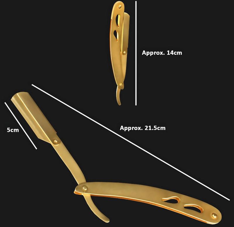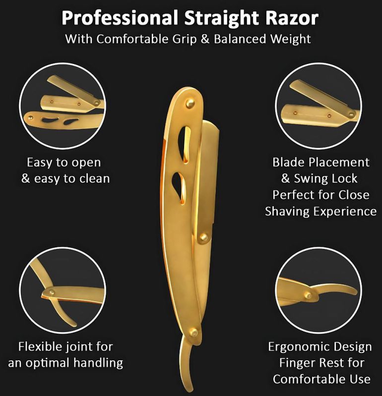 The Professional Straight Razor is designed for barbers and personal grooming, offering a comfortable grip and balanced weight for precise shaving. Made with durable stainless steel and an elegant gold finish, it ensures long-lasting performance and a premium look.