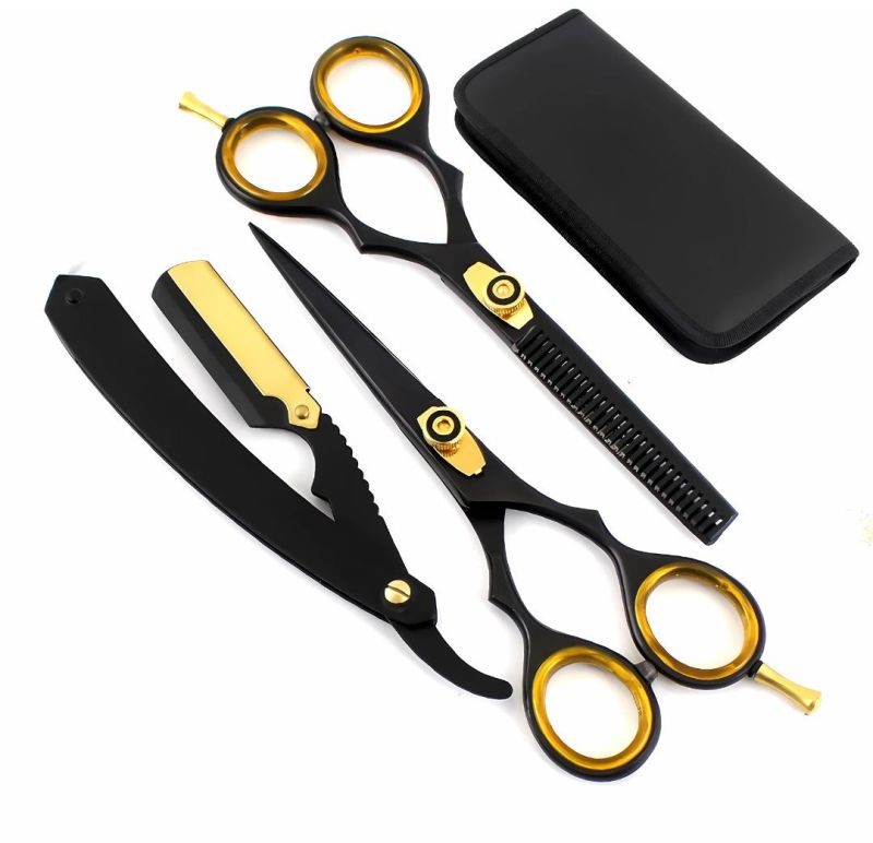 This Professional Barber Set includes a straight razor, hair cutting scissors, and thinning scissors – designed for barbers, salons, and personal grooming. Made with high-quality stainless steel, coated in elegant black and gold, this set ensures durability, sharp performance, and a premium look.
