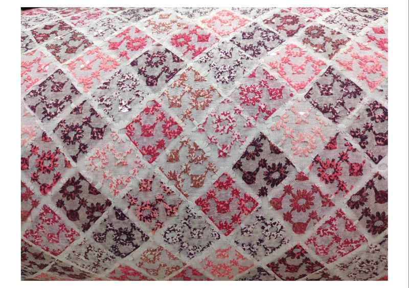 Elevate your fashion creations with the sheer elegance of our machine-made Chinon silk Schiffli embroidery fabric. Contact us today to place your order or request a sample, and unlock a world of creative possibilities!