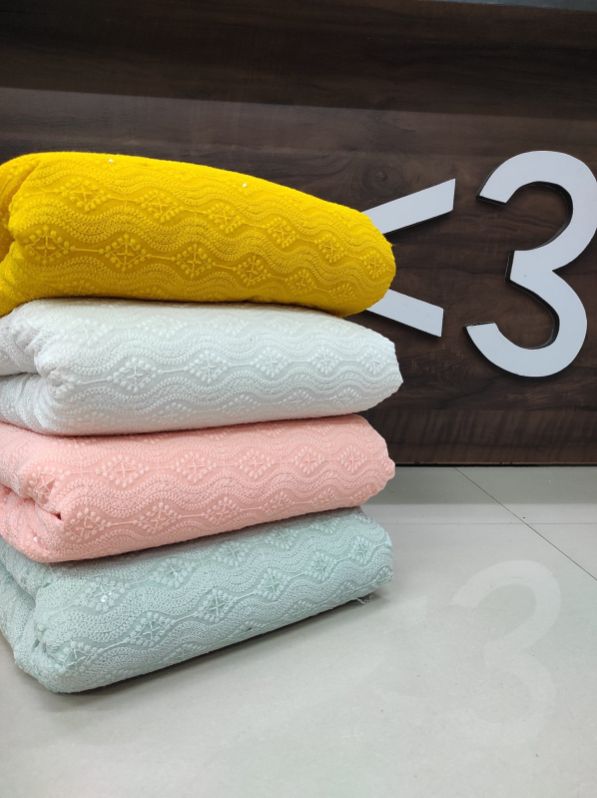 In summary, "New Arrival Georgette Chikan Embroidery Fabric" represents the introduction of a fresh collection of georgette fabric adorned with Chikan embroidery, allowing customers to explore a variety of options for creating elegant and fashionable garments and accessories.