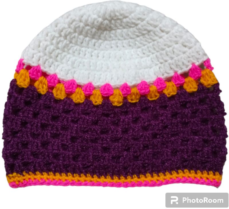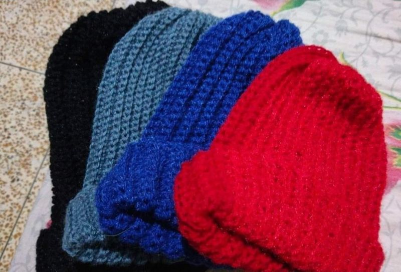 Hand crocheted woollen caps made with soft wool using different techniques like tuinisian crochet and ribbed crochet.
