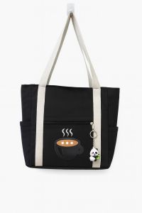 Coffee Cup Print Front Zip Pocket Black Canvas Tote Bag