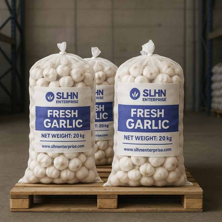 At SLHN Enterprise, we supply fresh garlic, dried garlic, garlic powder, and garlic extracts, sourced from trusted farms and processed under ISO, HACCP, and SGS-certified facilities. With bulk supply and export-ready packaging, our garlic products are trusted by food processors, spice manufacturers, nutraceutical companies, and distributors worldwide.