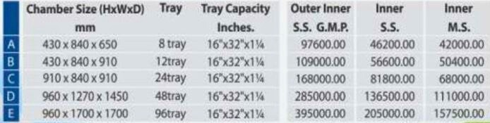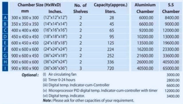 Temp. range from room to 90°C. Double door, with glass window. Inner chamber of anodized aluminium/stainless steel sheet. (Thermostatic/Digital Control options).