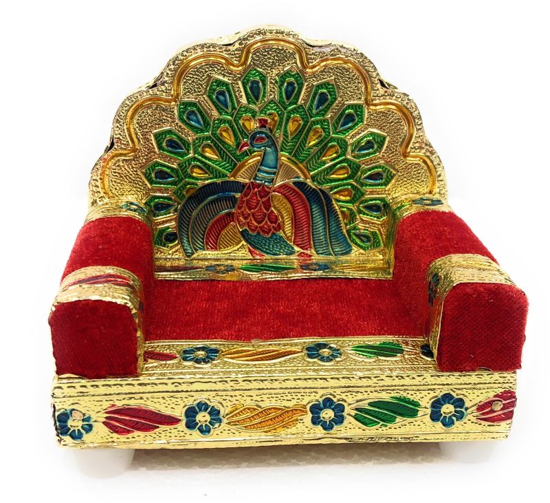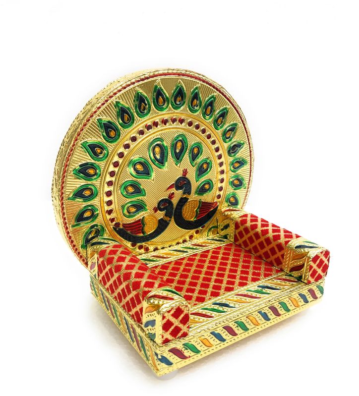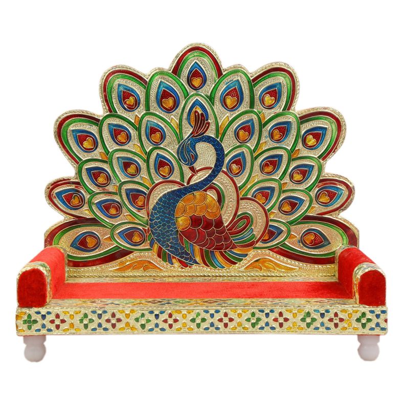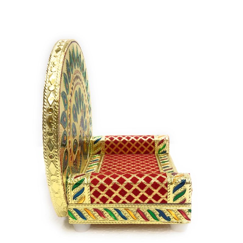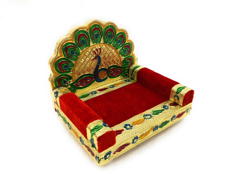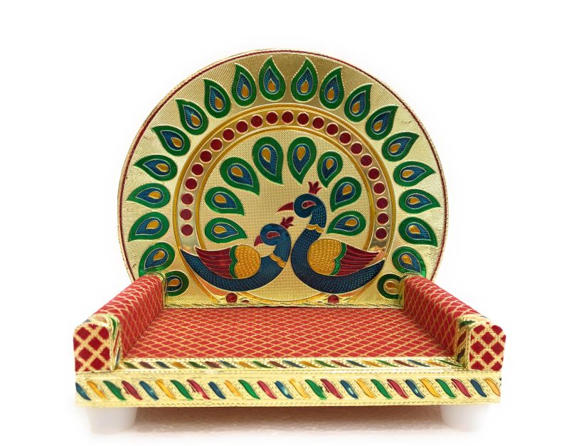 Design:Features ornate carvings, hand-painted artwork, and sometimes Meenakari or enamel detailing. Designs often include arches, pillars, steps, and intricate backrests, giving the sinhasan a royal temple-like appearance.