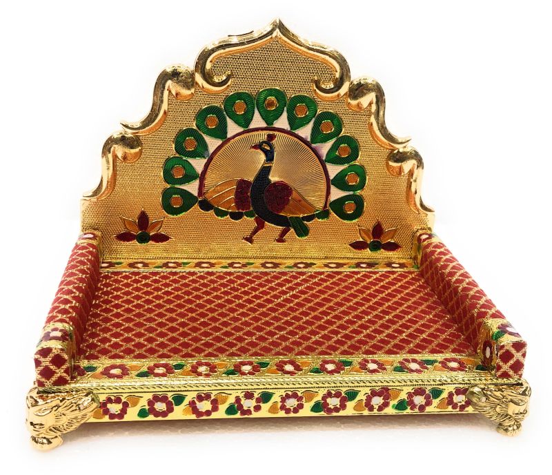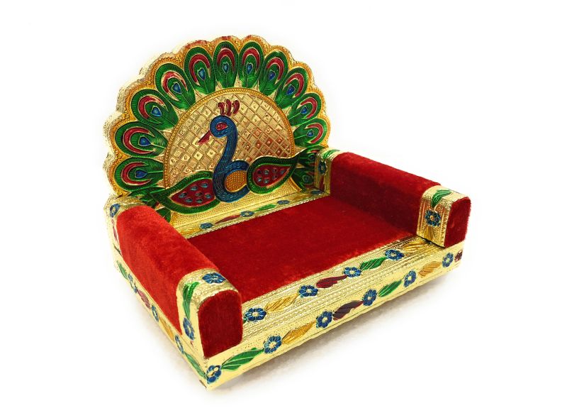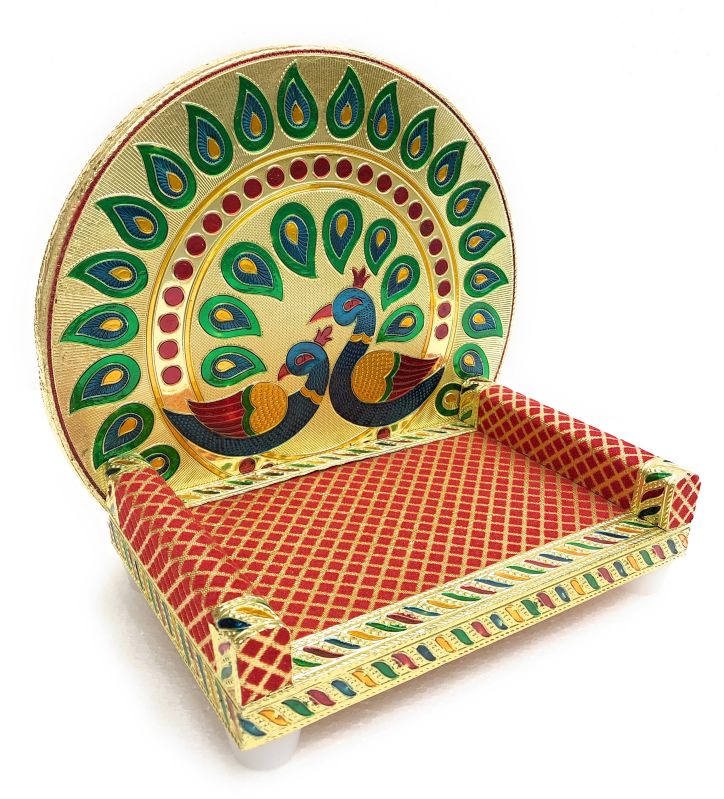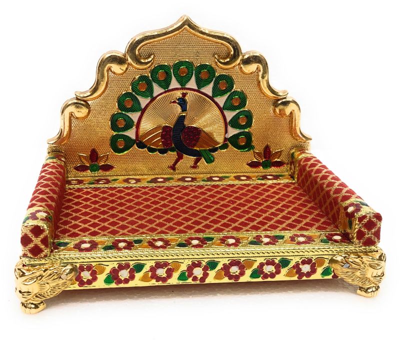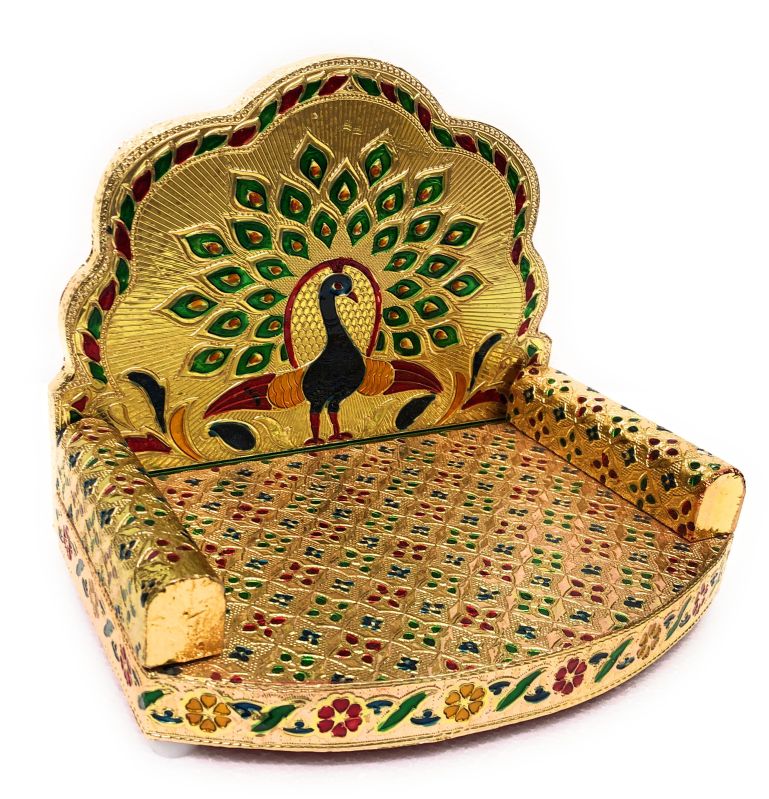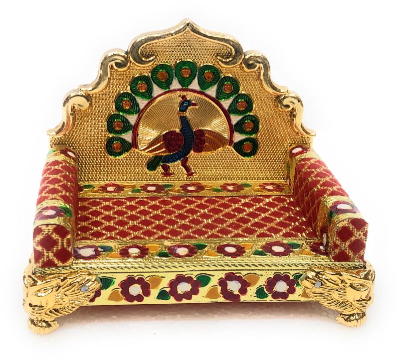 Design:Features ornate carvings, hand-painted artwork, and sometimes Meenakari or enamel detailing. Designs often include arches, pillars, steps, and intricate backrests, giving the sinhasan a royal temple-like appearance.