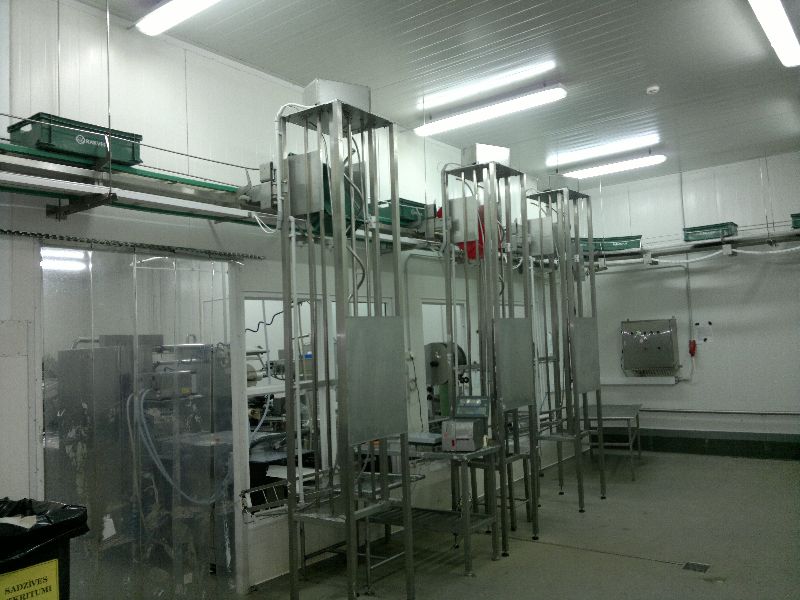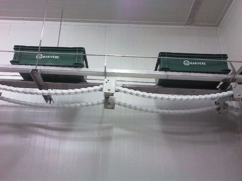 application: ensures transportation of empty containers from the container warehouse to packaging workplaces. Lines are fixed to the ceiling and they ensure supply of boxes to workplaces using spiral lifts. The boxes are supplied to the workplaces in intervals not exceeding three minutes. (the parameter may change depending on the line configuration and placement of workplaces.) principle of operation: - the warehouse worker ensures continuous feeding of boxes to the line which lifts them up to the line on the ceiling where distribution of boxes takes place according to a specific interval, and where boxes are fed to the distribution line using spiral lifts, accordingly distributing the boxes to workplaces. - the microcontroller surveys workplaces and, if a box is removed from the table at a particular workplace to which the box has been transferred from the lift, a request signal is sent to the microcontroller for feeding the next box to this workplace. (a shutter opens on the line, taking a box from the line to this workplace. While the box is not removed from the workbench, at the lift, the shutter is closed and the other boxes move to other workplaces.) benefits: 1. Cleanness and work optimization. Boxes from the warehouse do not have to be transported through common use premises towards packaging, the clean area. Work optimization, no unnecessary movement of people. 2. Saving space both in the warehouse and in the packaging areas. A large part of boxes can be placed on the line without taking up space in the warehouse. Only the prepackaged products are located in the packaging area. This ensures orderliness of the workplace.