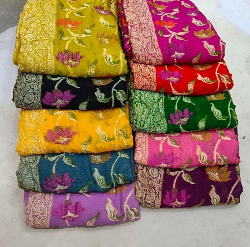 We offer the best product range of Banarsi Pure Shiffon Soft Silk Saree, Banarsi Semi Georgette Soft Sarees, Weaving Pure Tanchoi Silk Saree and Banarsi Organza Sarees.