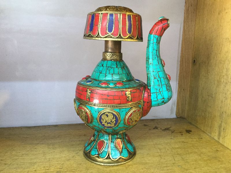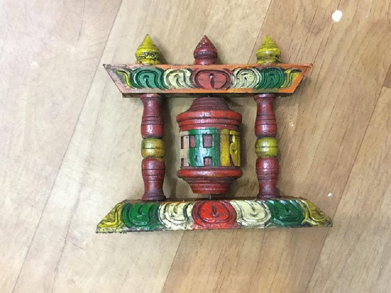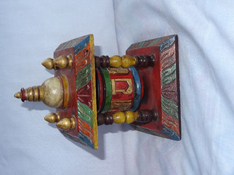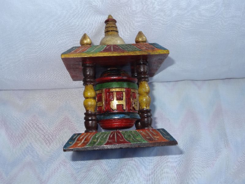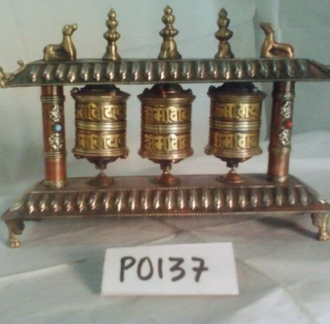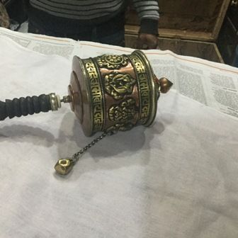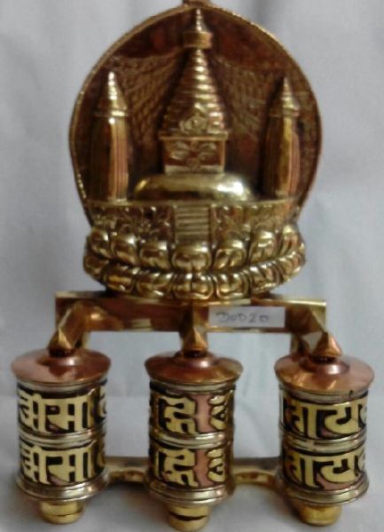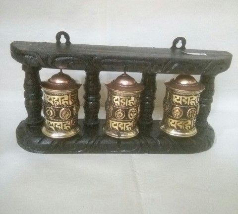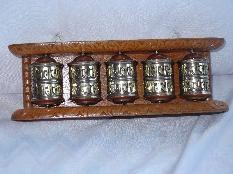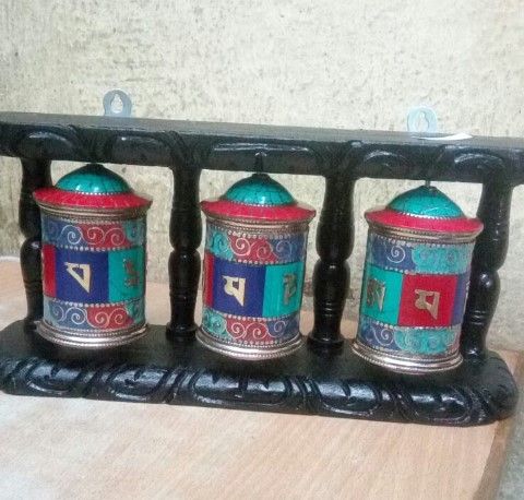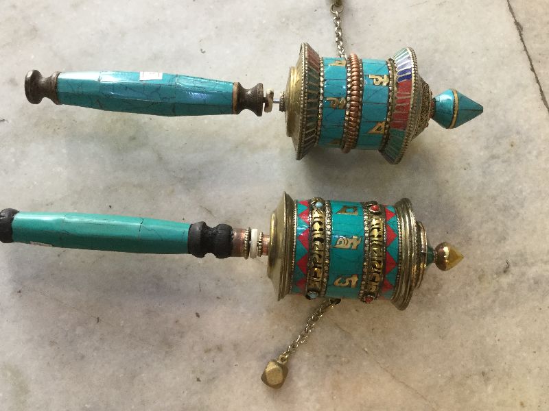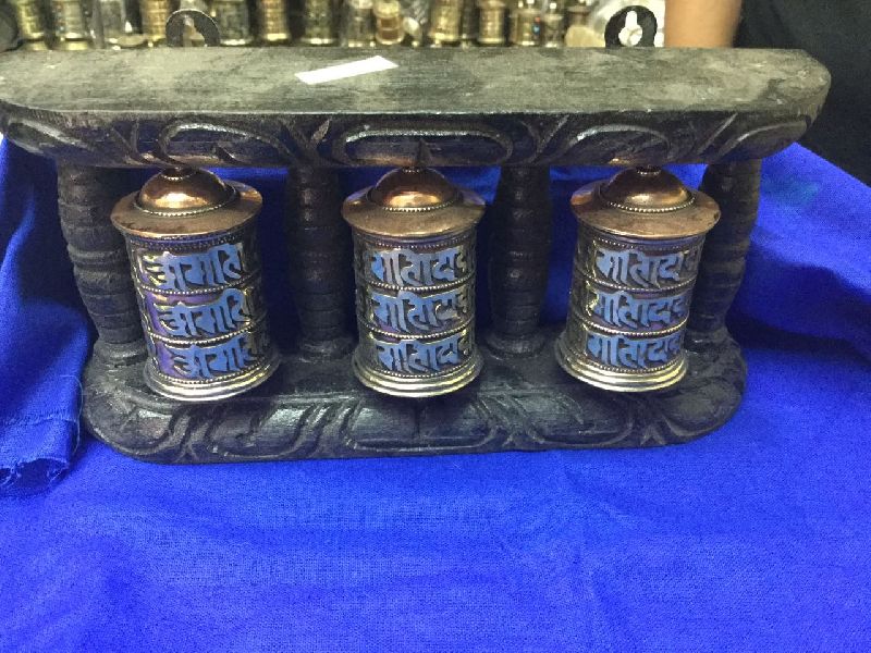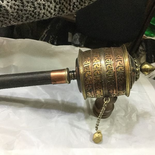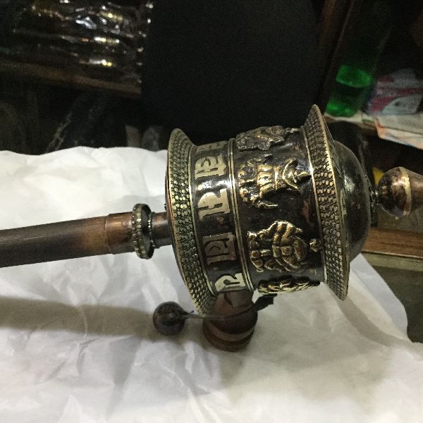It is exclusive Buddhist Praying instrument which always bears the mystical word " Om Mani Padme Hum" numbering six syllables in the Mantra of rnAvalokiteswora.Then syllables in the Mantra of Avalokitswara. The syllables are carved outside the wheels as well as kept inside the wheel printed in the paper in numerous number.When it turns one round it means the Mantra is read how many ch Mantra has kept inside the wheels