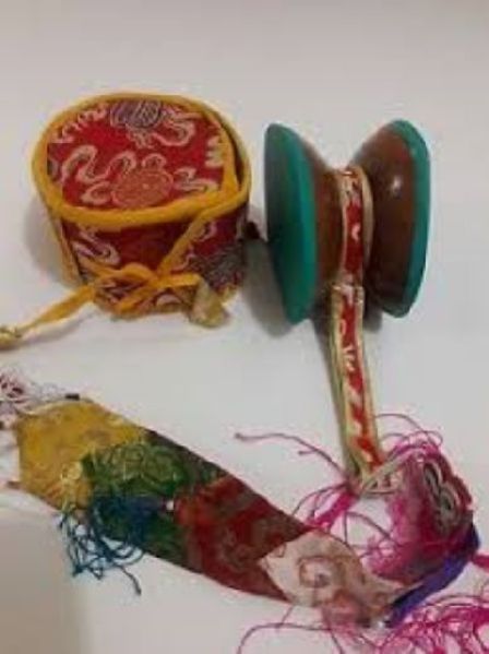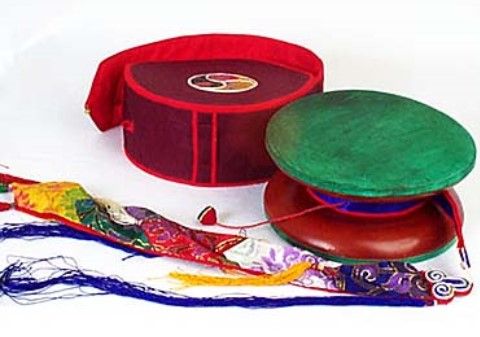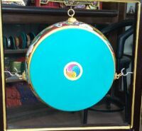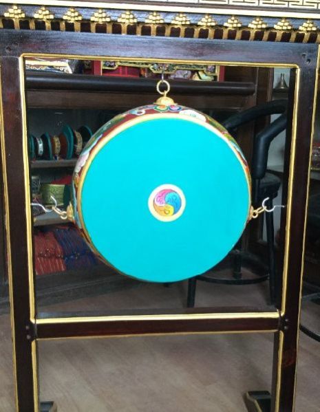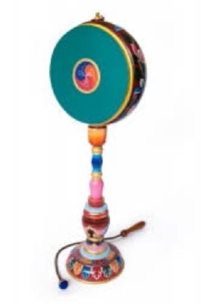 Tibetan Drum are cover by leather skin with turquorise color painted. Drum are available 2 ways- Hand drum & Stand drum.Wooden hand stand drum are available base drum 9 inches to 19 inches dimension because too big size of drum can be heavy and could not hold by hand when use.This hand drum use by tibetan lama when special ceremony held in monastry or other occusation.