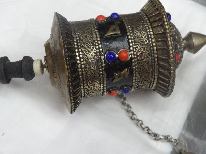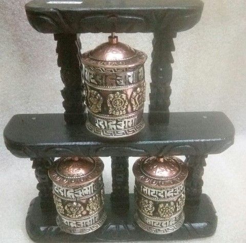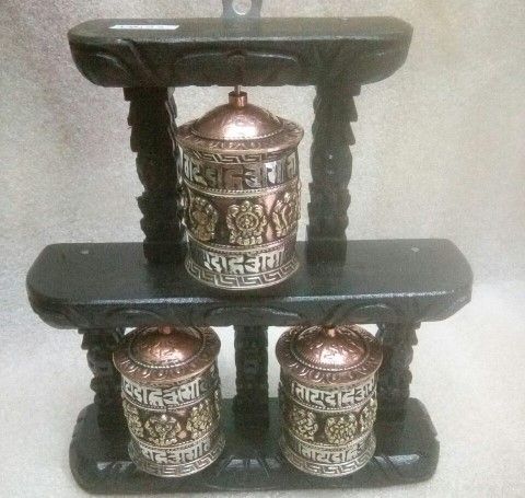buddhist ritual prayer wheels- exclusively buddhist praying instruments which always bears the mystical word " om mani padme hum"numbering 6 syllables in the mantra of avalokiteswara. they syllables are carved outside the wheels as well as numerous number. when it turns one round it means the mantra is read how much mantra has kept inside the wheels.