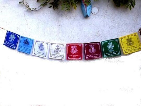 Buddhist Tradition, Prayer flags ar eused to promote peace, compassion, strength and wisdom. Prayer flags do not carry to gods but mantras will be blown by the spread the good will and compassion into alol pervading space.
