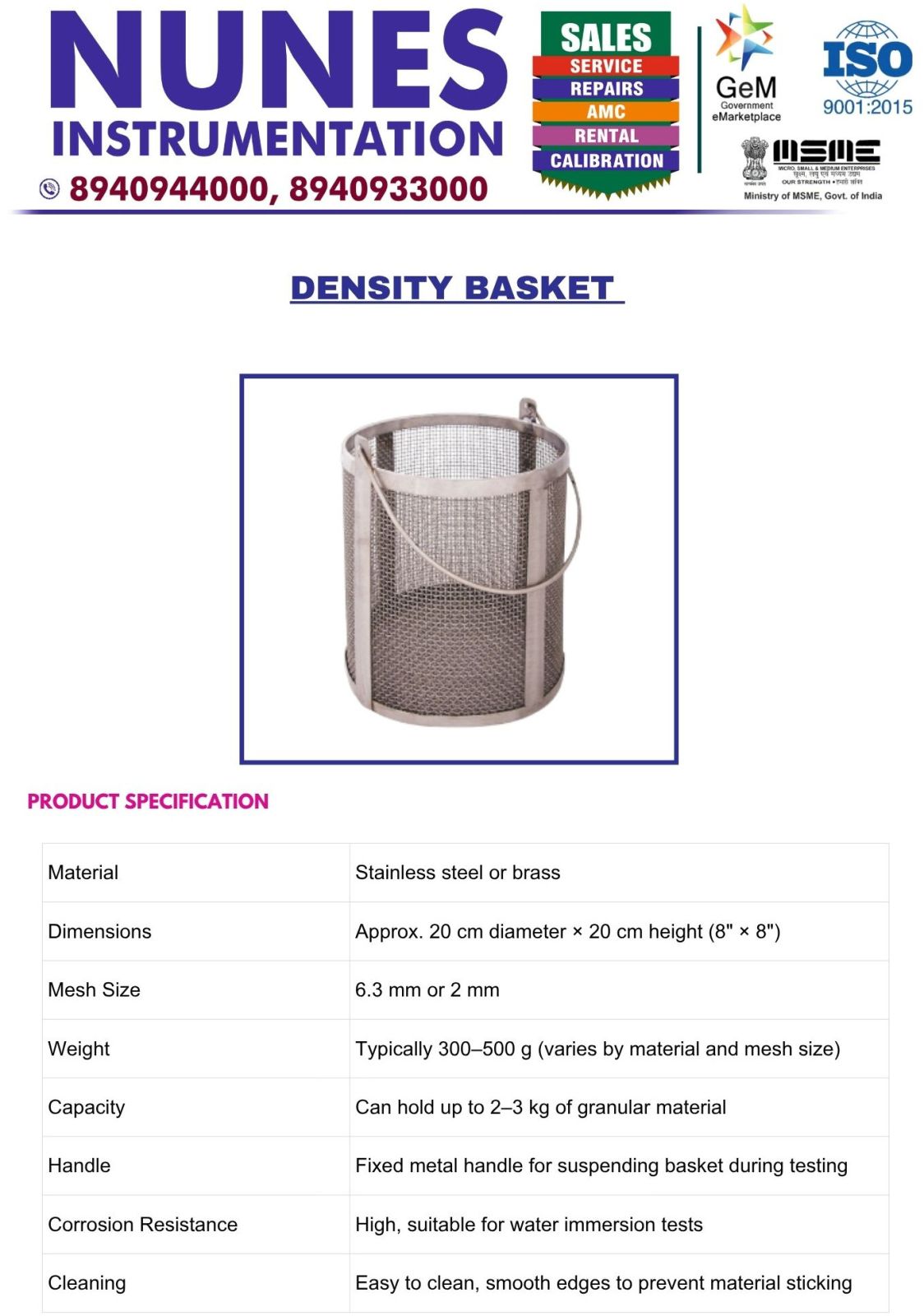 The Density Basket is a laboratory accessory designed for measuring the density and specific gravity of granular materials or aggregates. Constructed from stainless steel or brass, it ensures durability and resistance to corrosion, making it suitable for repeated use in laboratory and field conditions.