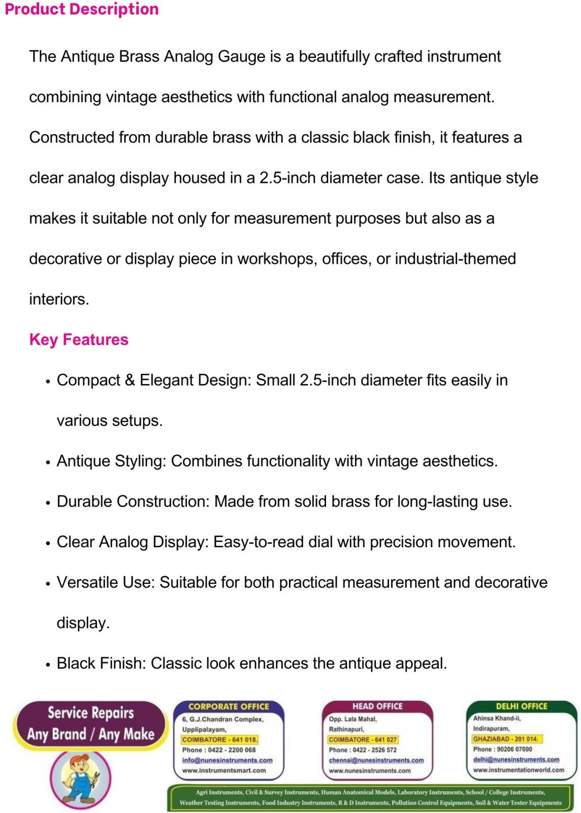 The Antique Brass Analog Gauge is a beautifully crafted instrument combining vintage aesthetics with functional analog measurement. Constructed from durable brass with a classic black finish, it features a clear analog display housed in a 2.5-inch diameter case. Its antique style makes it suitable not only for measurement purposes but also as a decorative or display piece in workshops, offices, or industrial-themed interiors.