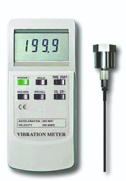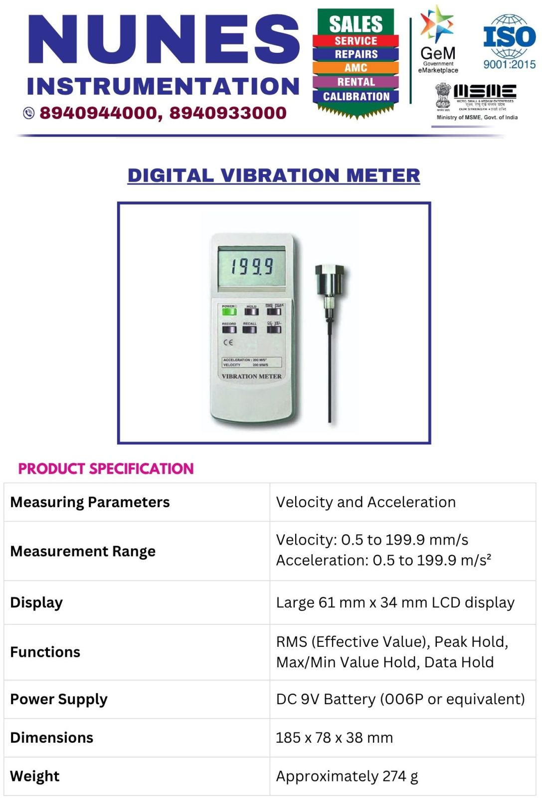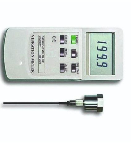 This digital vibration meter is a precision instrument designed for measuring both vibration velocity and acceleration in machinery and industrial equipment. It helps assess the mechanical condition of rotating components, ensuring smooth operation and preventive maintenance. The device features a large, easy-to-read LCD display and offers functions such as RMS measurement, peak hold, and data hold, enabling accurate and convenient field diagnostics.