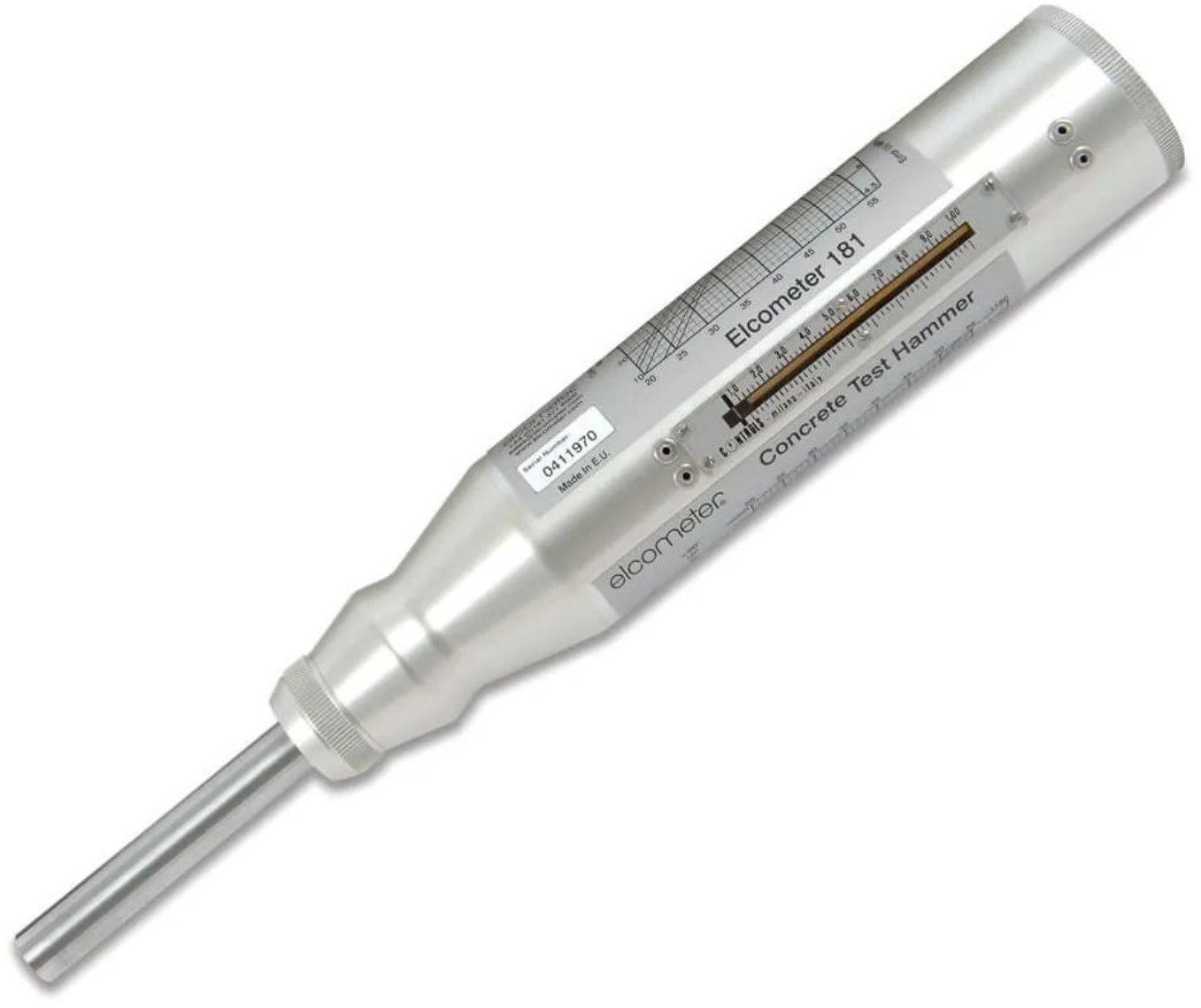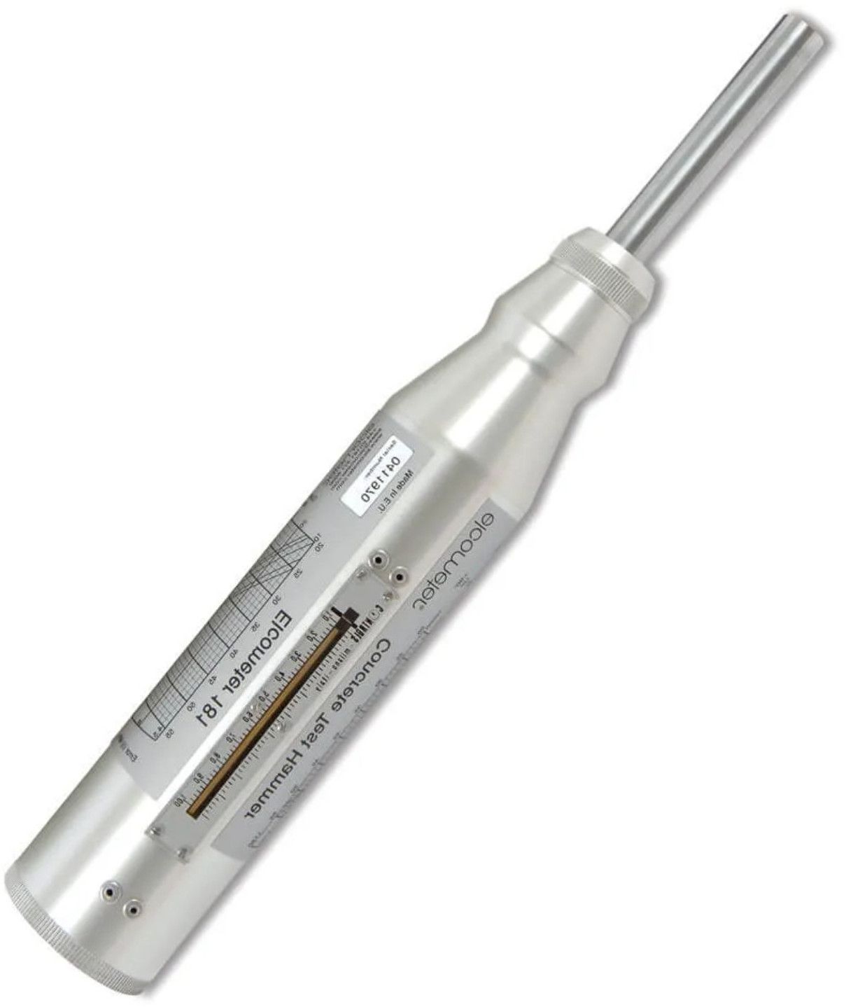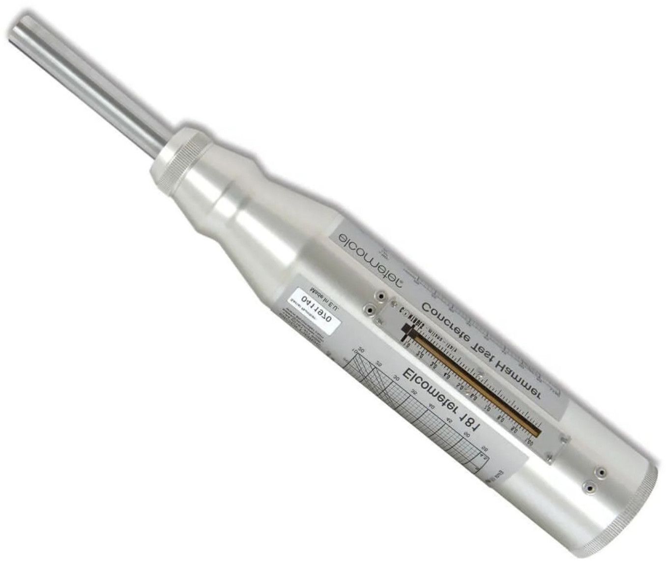 The Concrete Test Hammer is a non-destructive testing instrument designed to quickly estimate the compressive strength of concrete. It operates by measuring the rebound of a spring-driven mass impacting the concrete surface. The rebound value is clearly indicated on the hammer, allowing easy interpretation of concrete strength using the integrated chart.