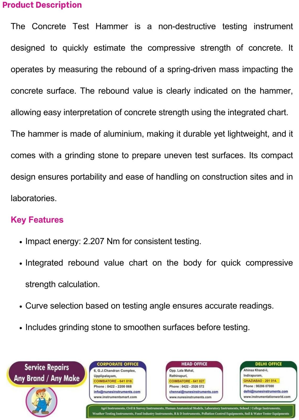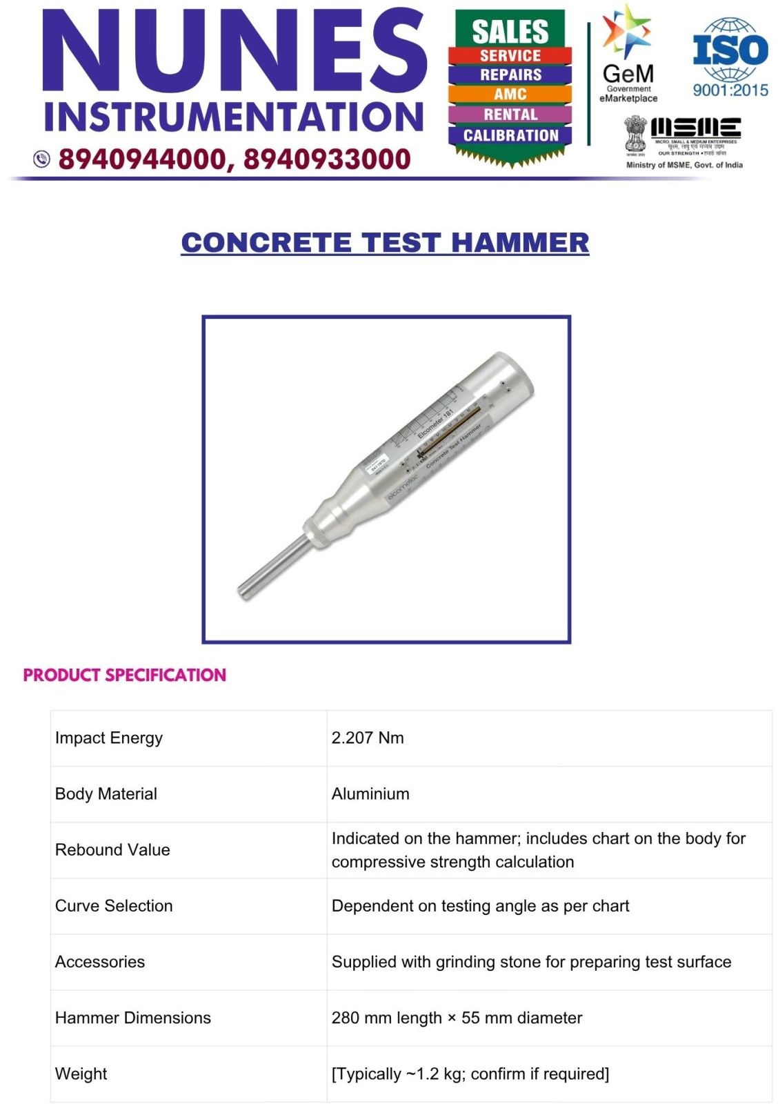 The hammer is made of aluminium, making it durable yet lightweight, and it comes with a grinding stone to prepare uneven test surfaces. Its compact design ensures portability and ease of handling on construction sites and in laboratories.