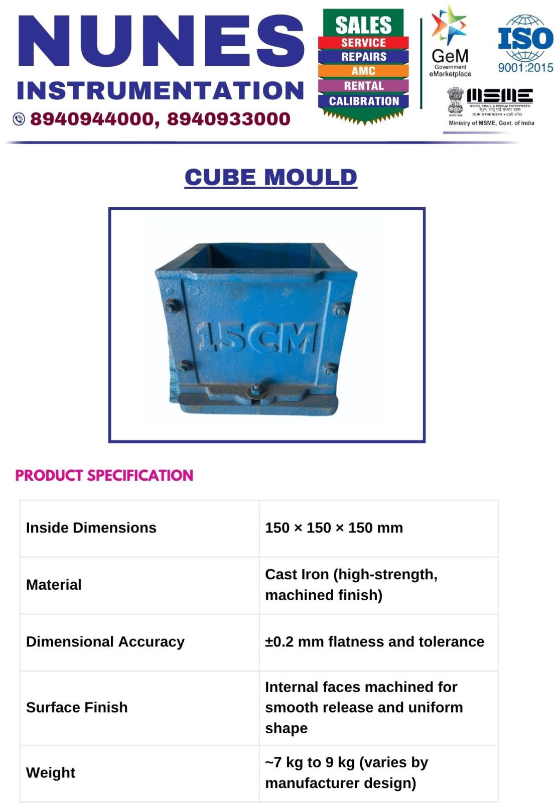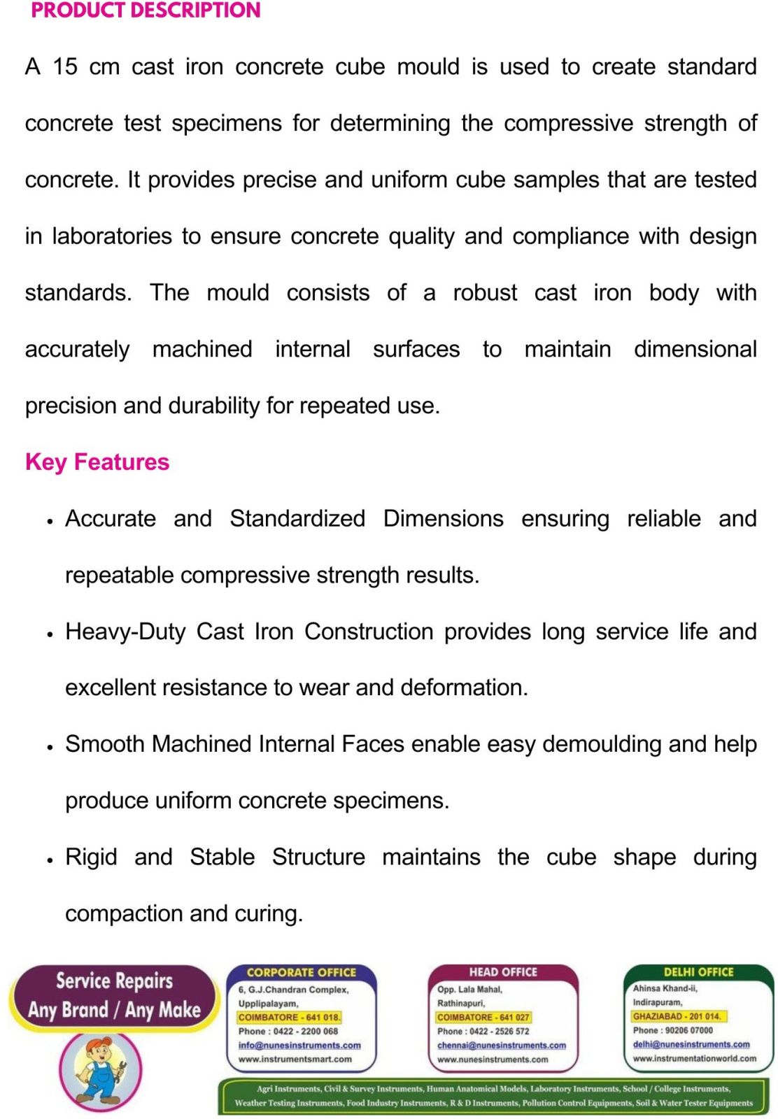 A 15 cm cast iron concrete cube mould is used to create standard concrete test specimens for determining the compressive strength of concrete. It provides precise and uniform cube samples that are tested in laboratories to ensure concrete quality and compliance with design standards. The mould consists of a robust cast iron body with accurately machined internal surfaces to maintain dimensional precision and durability for repeated use