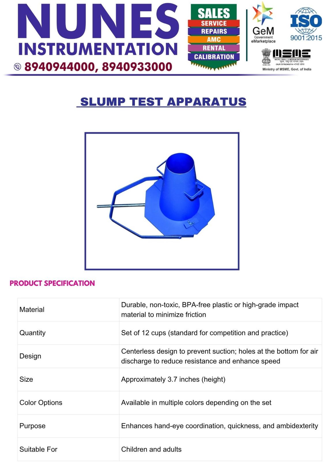 The Slump Cone Apparatus is a standard tool used for determining the workability and consistency of fresh concrete before it sets. The set consists of a metal slump cone, a sturdy base plate, and a tamping rod. The cone has a smooth interior surface to ensure accurate and repeatable results.