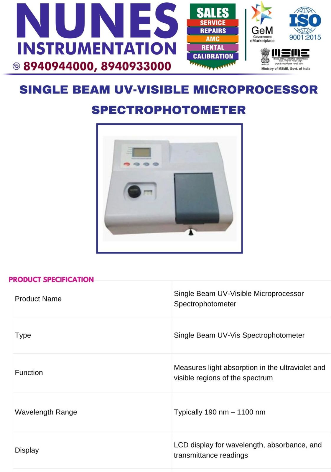 The Single Beam Microprocessor UV-Vis Spectrophotometer is a high-precision analytical instrument designed for quantitative and qualitative analysis across the ultraviolet and visible spectrum. It operates on a single-beam optical system and covers a wavelength range from 195 nm to 1020 nm.