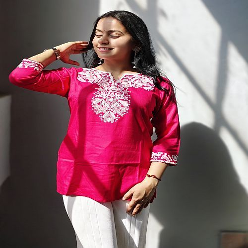 We offer a stylish Ladies Pink Embroidered Rayon Short Kurti in size L with a regular fit. This printed short kurti is made from high-quality rayon fabric, featuring short sleeves and beautiful embroidery. Perfect for casual wear, this kurti is machine washable for easy care. Packaged in a lovely pink packaging, this kurti is ideal for exporters, suppliers, and traders looking to add a trendy piece to their collection.