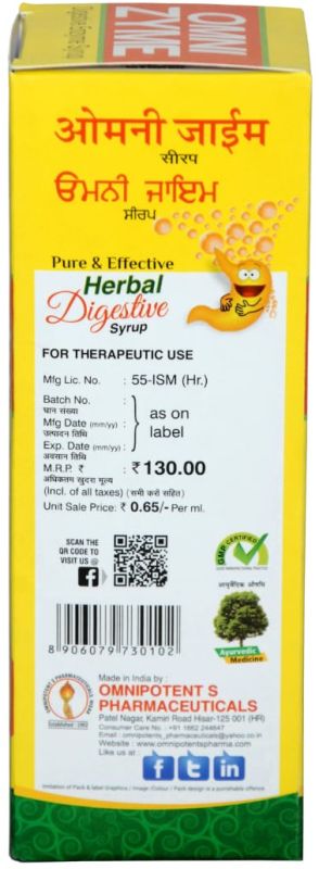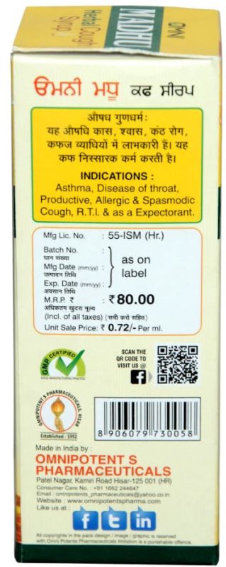 We are Offering Omni Madhu Syrup. Indications : Bronchitis, Spasmodic Cough, Whooping CoughCongestion of Respiratory Tract, Throat Irritation and as Expectorant Composition ( Each 10 Ml. Contains ) Bansa250 mg.Samlata250 mg.Mulathi250 mg.Kakra Singhi125 mg.Tulsi250 mg.Gulbanfasha250 mg.Lisoda125 mg.Khatmi125 mg.Gajban125 mg.Kantkari250 mg.Nilgiri Tail0.006 ml.Sudh Madhu0.500 gm. Available In : 60 ml. & 110 ml.