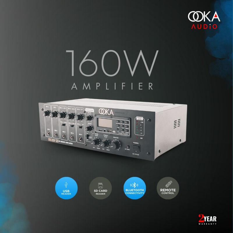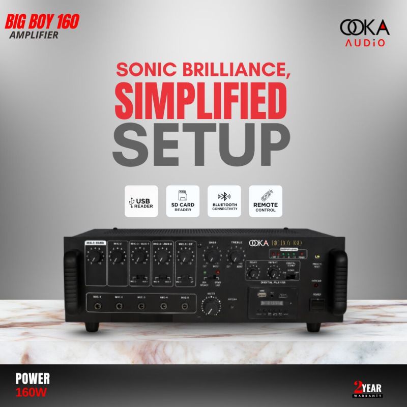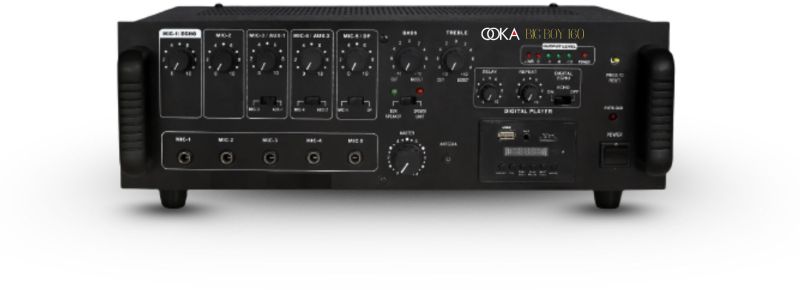 OOKA Big Boy 160Amplifierdelivers160W RMS of powerful, distortion-free sound. With 5 mic inputs, 2 aux inputs, and versatile speaker outputs (4, 8, 70V & 100V), it ensures seamless connectivity. Its wide frequency response and precise tone controls make it ideal for professional audio setups and events.