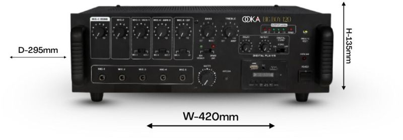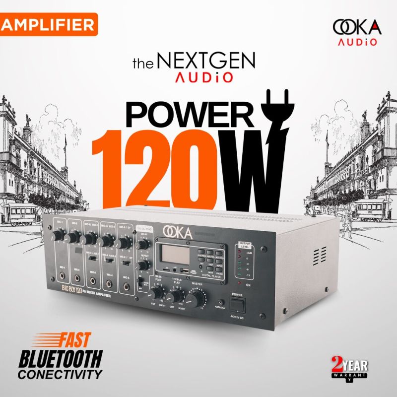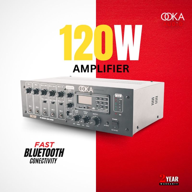 OOKA Big Boy 120 Amplifier delivers 120W RMS of powerful, distortion-free sound. With 5 mic inputs, 2 aux inputs, and versatile speaker outputs (4Ω, 8Ω, 70V & 100V), it ensures seamless connectivity. Its wide frequency response and precise tone controls make it ideal for professional audio setups and events.