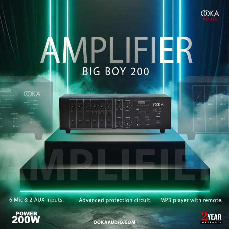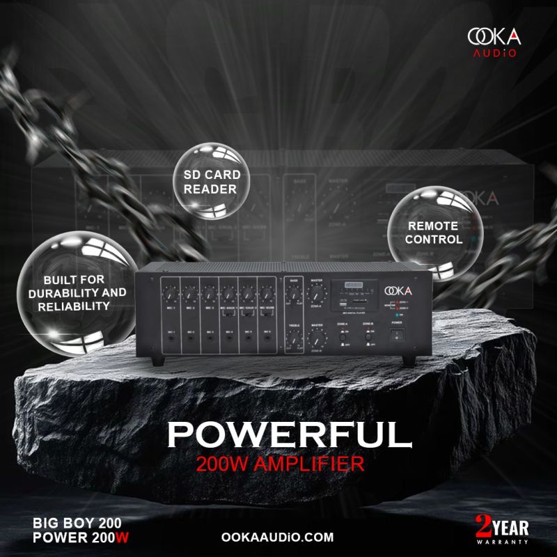 Experience powerful and crystal-clear sound with the OOKA Big Boy Amplifier. With dual zones delivering 100W RMS each, it supports up to 6 mic inputs, MP3 playback via USB/SD/MMC, and a wide frequency response of 65Hz–15kHz. Designed with advanced protection, bass/treble control, and multiple output options, it’s perfect for professional sound setups in auditoriums, events, and commercial spaces. Durable, efficient, and built for nonstop performance.