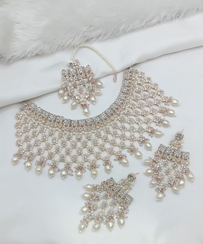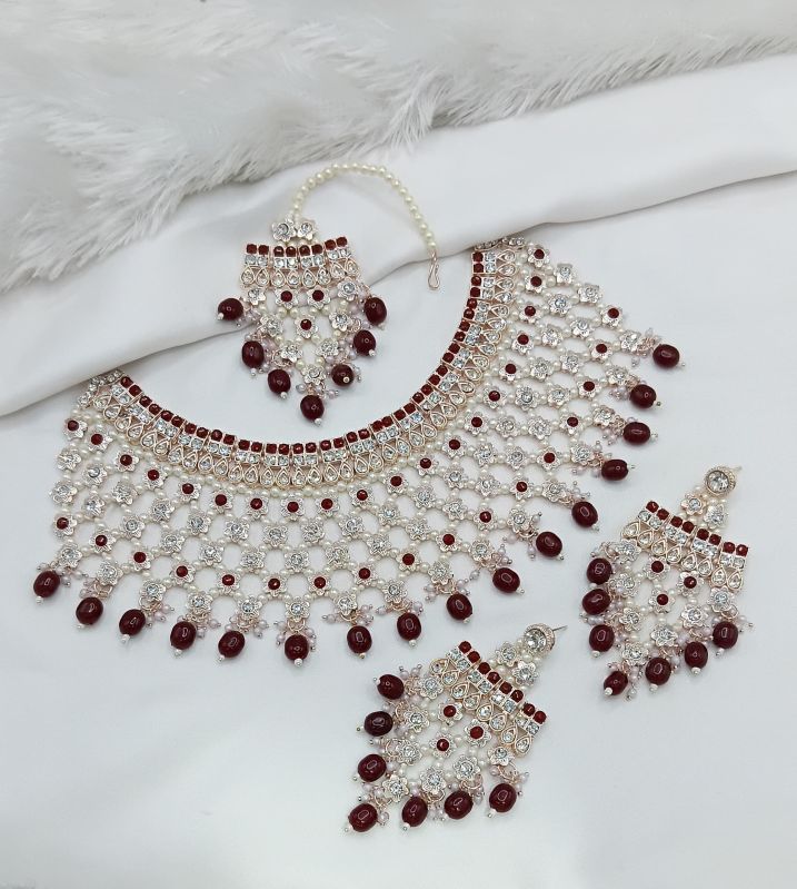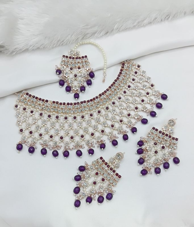 Colored Pearl Necklace Set exudes classic elegance with a modern twist. This set features a beautifully crafted necklace adorned with lustrous pearls and vibrant beads, offering a sophisticated and eye-catching design. Complemented by matching earrings, it’s perfect for adding a touch of grace to any outfit, from casual to formal occasions.Traditional Kundan Choker Bridal Necklace Set Enhance your bridal look with this exquisite Traditional Kundan Choker Necklace Set. Featuring intricate Kundan craftsmanship and a rich gold-plated finish, this set is perfect for adding timeless elegance to your wedding ensemble. The choker design offers a regal touch, while the matching earrings complete the look with grace. Ideal for brides seeking a blend of tradition and luxury. Country of Origin: India