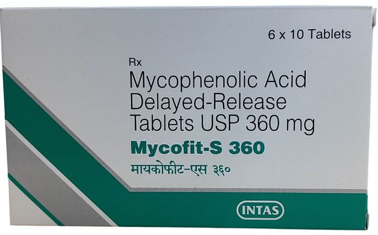 Mycofit-S 360 mg Tablet contains mycophenolate sodium, an immunosuppressant used to prevent organ rejection in transplant patients. It works by suppressing the immune system, reducing the likelihood of the body attacking the transplanted organ. This medication is typically prescribed alongside other immunosuppressive agents, such as corticosteroids and ciclosporin, to enhance its effectiveness. Common side effects may include nausea, vomiting, diarrhea, abdominal pain, headache, and high blood pressure