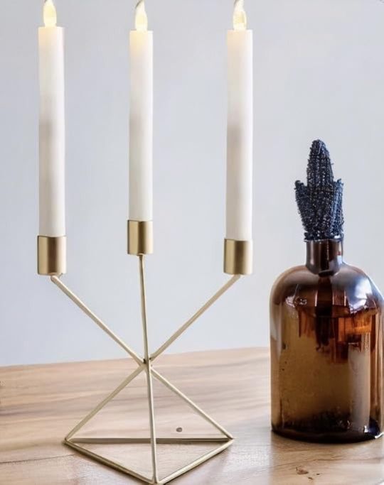 Key Features:Design: Features a dynamic triangular base with intersecting lines that form a stable, sculptural silhouette. The three elevated candle holders rise in a balanced arrangement, creating visual interest from every angle.