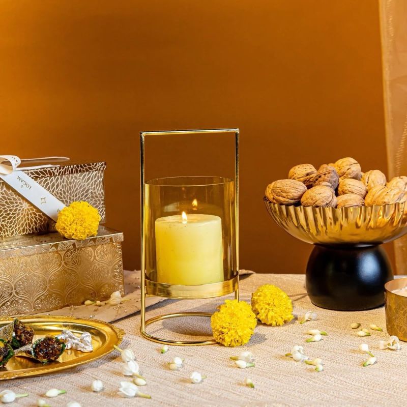Key Features:Design: A sleek cylindrical glass holder encased in a minimalistic gold metal frame, offering a modern take on the classic hurricane lantern.