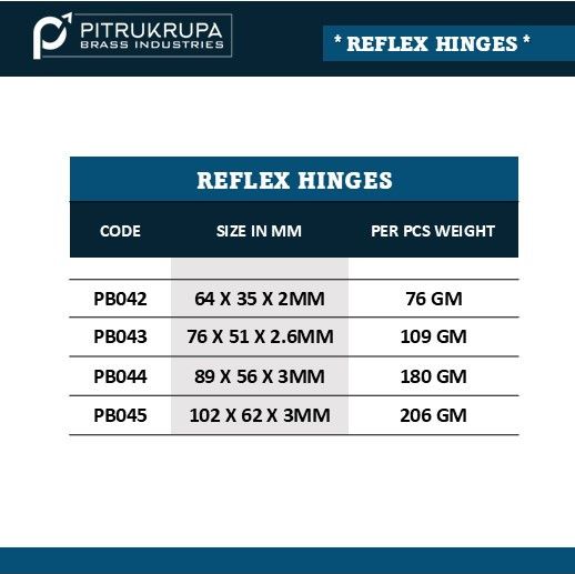 The Reflex Hinges from Pitrukrupa Brass Industries offer a blend of durability and aesthetic appeal, engineered to support various types of doors with ease. Made from high-quality brass, these hinges are built to resist corrosion, ensuring long-term functionality and a polished look over time. The reflex hinge design allows doors to close smoothly and securely, making it ideal for spaces where quiet and efficient door operation is needed.