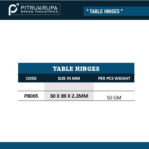 Pitrukrupa Brass Industries' Table Hinges are designed to meet the unique requirements of folding tables and similar furniture pieces. Made from high-quality brass, these hinges ensure durability and reliable performance, supporting frequent folding and unfolding actions. The sleek, rounded design not only adds aesthetic appeal but also minimizes sharp edges, making it safe and ideal for tables in homes, offices, and commercial spaces.