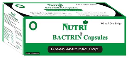 Contact SupplierNutri Bactrin Capsule:- Green Antibiotic capsule, Active against wide micro organisms including gram+ve & gram-ve, Effective against E.coli,Salmonella,Staphylo Coccus,Brucella,Stepto Coccus. Decontaminant of meat, fish and egg through green antibiotic. Nutri Bactrin has bactericidal and bacteriostatic effect. Nutri Bactrin Cap used for Digestive problem with loose stool- diarrhoea, Kidney Problem-frequent micturation-Burning sensation with temperature, Food Poisoning vomiting, Boils, Carbuncles-unhealed wounds or Septicemia,Diabetic ulcer, Skin Infection-foliculitis-Furunculosis, Cystitis,Pyelitis & Pylonephritis. INDICATION OF NUTRI BACTRIN:- Staphylococcus aureus Skin : (i) Furuncles (ii) Cellulitis (iii) Impetigo (iv) Carbuncles Lungs : (i) Pneumonia (ii) Lung abscess Heart : (i) Endocarditis (ii) Pericarditis C.N.S. : (i) Meningitis (ii) Brain abscess Bones and Joints : (i) Osteomyelitis Miscellaneous (i) Parotitis (ii) . Enterocolitis (iii) Septicaemia (iv) Influenza Due to Toxin : (i) Staphylococcus food poisoning (ii) Scaled skin syndrome (iii) Generalised erythema (iv) Bulus impetigo (v) Staphyloccus scarlet fever E.coli Urinary Tract Infection :(i) Cystitis (ii) Pyelitis (iii) Pylonephriritis Appendicitis Peritonitis Cholecystitis Gastroenteritis Septic Wounds Burns Fungus Oteomycosis Muringomycosis Maduromycetoma Pulmonary mycetoma Salmonella (i) Salmonella typhosa, Paratyphosa (ii) Enteritis