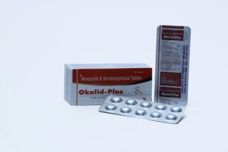 Product Name: Okalid-plus Composition: Nimesulide100mg, Serratiopeptidase10mg Tablets Pack Size: 10*10 Packaging Type: Alu-Alu Therapeutic Category: Anti-inflammatory